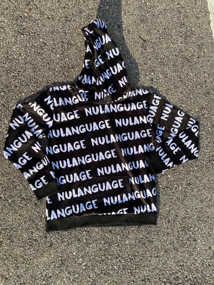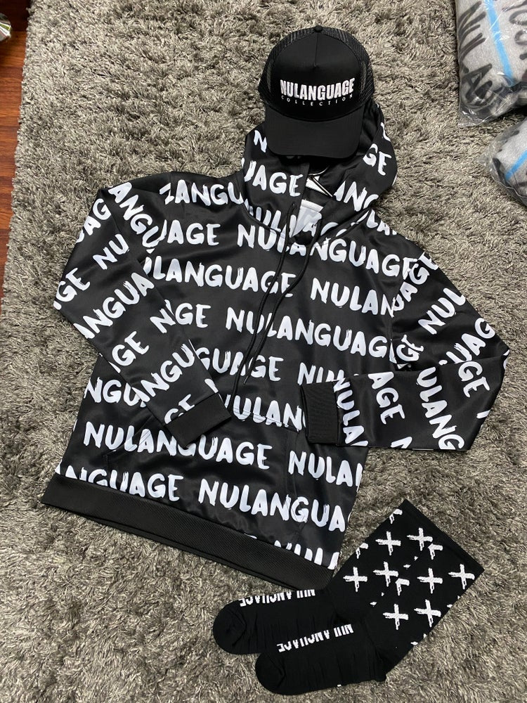 100 % Polyester ALL OVA HOODIE WITH HIDDEN POCKET Color: BLACK/WHITE Order one size up ( If you need medium .. Order Large) (If you need XS... Order small)
